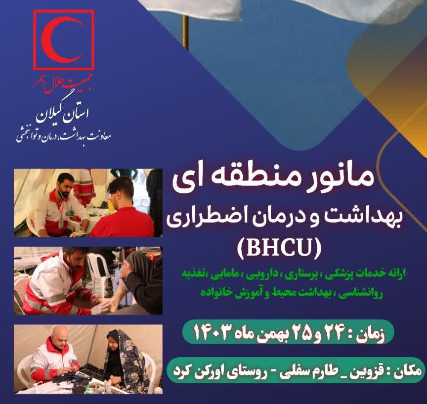 مدیر عامل جمعیت هلال احمر استان گیلان گفت : مانور درمان اضطراری با حضور 20 نفر از پزشکان و پیراپزشکان و نجاتگران جمعیت هلال احمر به مدت دو روز از 24 بهمن در روستای اورکن کرد بخش طارم سفلی استان قزوین برگزار میشود .